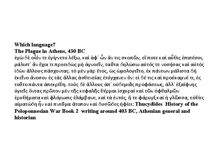 Authorship: Who wrote the document? Where did he come from? Was he an eye-witness of the events described? Judge whether he had a particular point-of-view, or perspective, and what it was? Audience: Who did the author write for? Who might be interested in this information? What do you think a ‘physician’ is? The Plague in Athens, 430 BC. . . I had the disease myself, and watched its effects of others. . . As a rule, however, there was no ostensible cause; but people in good health were all of a sudden attacked by violent heats in the head, and redness and inflammation in the eyes, the inward parts, such as the throat or tongue, becoming bloody and emitting an unnatural and fetid breath. These symptoms were followed by sneezing and hoarseness, after which the pain soon reached the chest, and produced a hard cough. When it fixed in the stomach, it upset it; and discharges of bile of every kind named by physicians ensued, accompanied by very great distress. In most cases also an ineffectual retching followed, producing violent spasms, which in some cases ceased soon after, in others much later. Externally the body was not very hot to the touch, nor pale in its appearance, but reddish, livid, and breaking out into small pustules and ulcers. But internally it burned so that the patient could not bear to have on him clothing or linen even of the very lightest description; or indeed to be otherwise than stark naked. What they would have liked best would have been to throw themselves into cold water; as indeed was done by some of the neglected sick, who plunged into the rain-tanks in their agonies of unquenchable thirst; though it made no difference whether they drank little or much. Thucydides History of the Peloponnesian War Book 2 writing around 403 BC, Athenian general and historian Purpose: What is the author describing? List three symptoms. Why do you think the author wanted to record these events? Conclusion: How might an historian living today use this source? Write a one paragraph summation of this material OR an evaluation of what it tells us about ancient times.