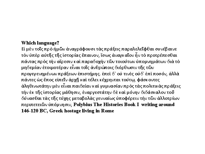 Which language? The Author’s Flight from the Siege of Amida, 359 AD Itaque vespera tenebrante, cum adhuc licet iniqua reluctante fortuna, multitudo nostrorum manu conserta distringeretur, in abstrusa quadam parte oppidi cum duobus aliis latens, obscurae praesidio noctis postica per quam nihil servabatur evado, et squalentum peritia locorum, comitumque adiutus celeritate, ad decimum lapidem tandem perveni. In qua statione lenius recreati, cum ire protinus pergeremus, et incedendi nimietate iam superarer, ut insuetus ingenuus, offendi dirum aspectum, sed fatigato mihi lassitudine gravi levamen impendio tempestivum. Ammianus Marcellinus The Roman History writing around 390 AD, Roman Government official, Syrian living in Rome