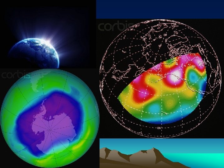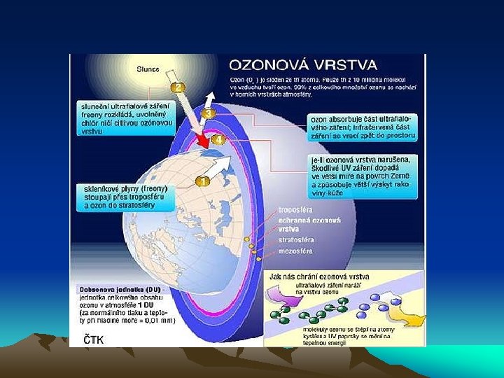 • Hrúbka a stav ozónu nad jednotlivými miestami zavisí od ich zemepisnej šírky, výšky nad zemským povrchom a od ročného obdobia. Najväčší úbytok ozónu je nad južnými polárnymi oblasťami. Množstvo atmosferického ozónu sa udáva v Dobsonových jednotkách. • Od 80 -tych rokov 20 -teho storočia vedci pozorujú nad Antarktídou jav, ktorý nazývame ozónová diera. Je to viac ako 50%-ná dočasná strata ozónu v stratosfére. Vzniká v jarných mesiacoch (september až november) a každoročne sa zväčšuje. Vytvára sa vďaka súhre niekoľkých podmienok. Počas zimy sa v Antarktíde vplyvom neprítomnosti slnečného svitu extrémne ochladí. To vytvára obrovský rotujúci polárny vír, ktorý zabraňuje, aby sa dovnútra víru dostal vzduch bohatší na ozón. Teplota tu klesá až na -90 °C a vytvárajú sa mrznutím riedkej vodnej pary stratosferické mraky. Freóny prítomné v atmosfére vymrazujú chlórované látky na povrchu stratosferických mrakov. Po dopade prvých jarných lúčov slnka sa začína búrlivá reakcia rozkladu ozónu a trvá nerušene mnoho týždnov až kým sa nezačne vír v teplejších mesiacoch sám rozpadať. Ozónová vrstva je pre život na Zeme nevyhnutná. • V súčasnosti pozorujeme, že na zemský povrch dopadá viacej UVžiarenia. Rastliny, živočíchy ani ľudia nie sú prispôsobení prijímať veľké dávky tohto žiarenia.