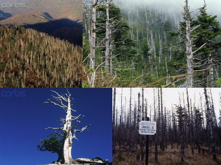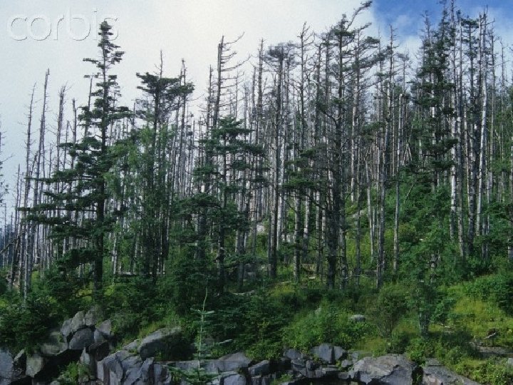 Čo majú teda za následok kyslé dažde? • zvýšenú chorobnosť ľudí (choroby dýchacích ciest) • znižovanie pôdnej úrodnosti • poškodenie lesného porastu (hrdzavenie ihličnanov) • vytváranie smogu nad väčšími mestami