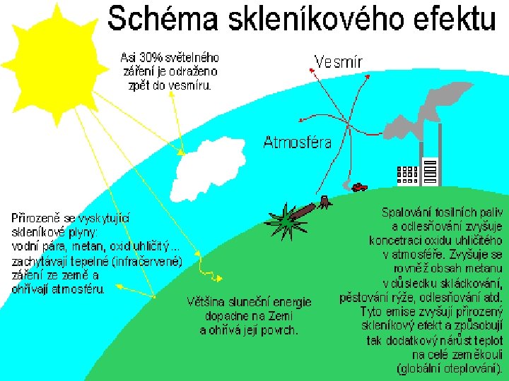 • Ked je povrch zahriaty na určitú teplotu, vydáva sám dlhovlnné žiarenie, označované ako infračervené. Časť infračerveného žiarenia pohltia práve skleníkové plyny a časť žiarenia uniká atmosférou spät do vesmíru, odkiaľ vlastne predtým slnečné lúče prišli. • Takéto chemické diery, ktorými energia zo zemského povrchu uniká, nazývame radiačné okná. Do atmosféry však uniká stále viac oxidu uhličitého a ďalších plynov, ktoré dokážu zavrieť tieto radiačné okná, čím dôjde ku globálnemu otepleniu. • Klimatológovia predpokladajú, že ak nedôjde k výraznému zníženiu emisie skleníkovývh plynov, bude koncom 21. storočia na Zemi priemerná teplota vzduchu o 2 -5 °C vyššia, ako bol priemier v rokoch 1951 -1980.