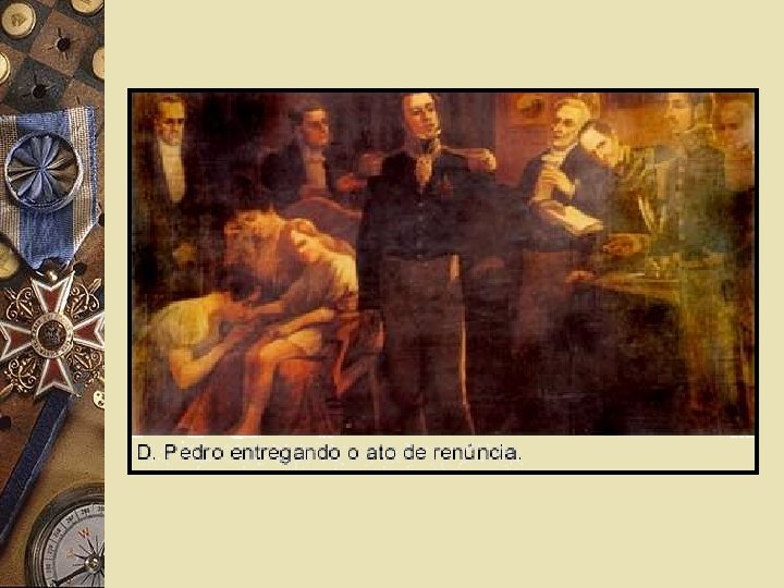 Abdicação de D. Pedro I • Manifestações populares contra o monarca após a morte de Líbero Badaró (jornalista liberal de São Paulo) por pessoas ligadas a D. Pedro; • Noites das Garrafadas (março de 1831); • Revolta de militares brasileiros; • 07 de abril de 1831: abdicação de D. Pedro I em favor de seu filho Pedro de Alcântara.