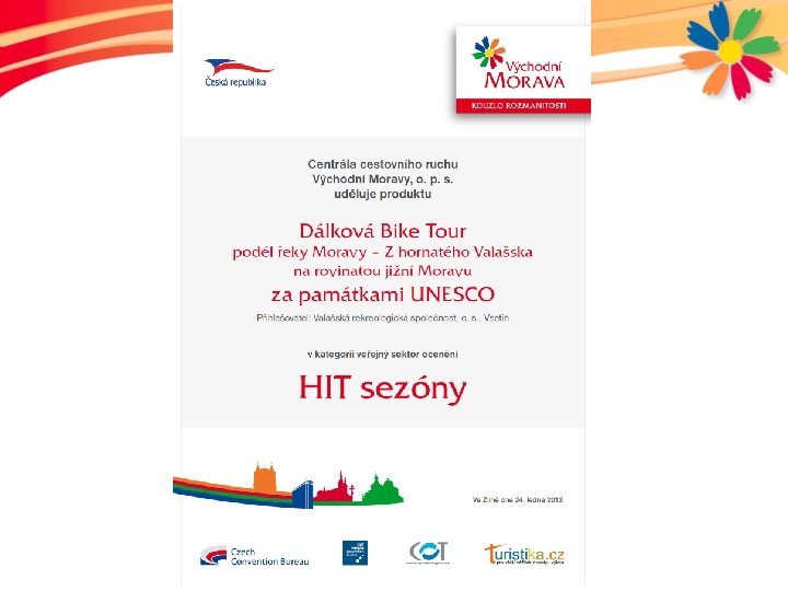 Vítězný HIT sezony • Dálková Bike Tour podél řeky Moravy– z hornatého Valašska na rovinatou jižní Moravu za památkami UNESCO • Valašská rekreologická společnost, o. s. • Kateřina Sobotková, Pavla Vostrejžová • Dálková Bike tour je několikadenní přejezd valašských hor a středního Pomoraví s dojezdem do krásného Lednicko-Valtického areálu, památky UNESCO. • Celková délka trasy je ve variantách od 190 do 300 km. Alternativně jsou trasy vedeny po cyklostezkách (trekingové kolo) či terénem po značených cyklotrasách (horské kolo).