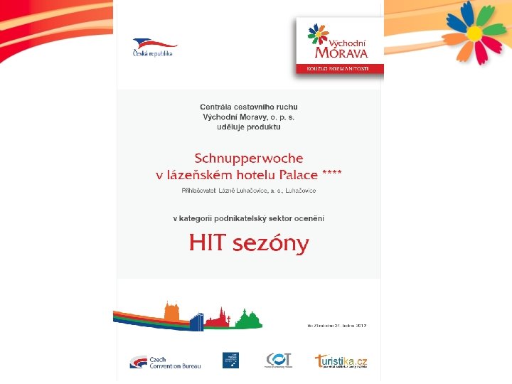 Vítězný HIT sezony • Schnupperwoche v lázeňském hotelu Palace **** • Lázně Luhačovice, a. s. • Produkt určený k oslovení zahraničního klienta, který nemá zájem o klasickou léčbu v lázních. Jedná se o novou cílovou skupinu, netypický lázeňský segment, které se nabízí možnost spojení příjemného prostředí a kultury s péčí o své zdraví a tělo.