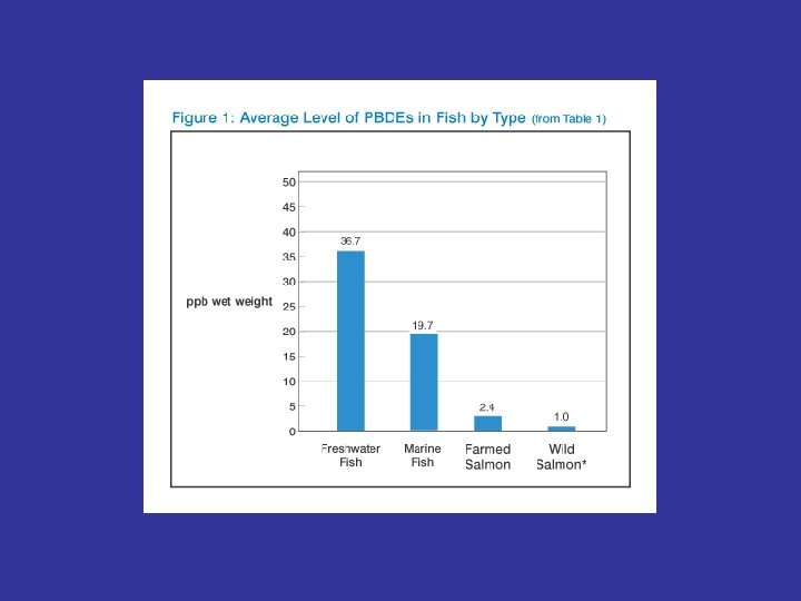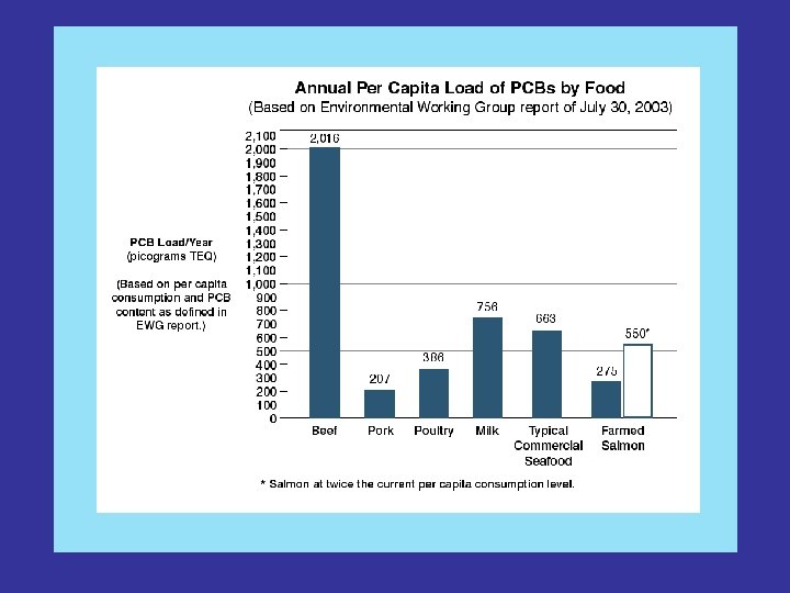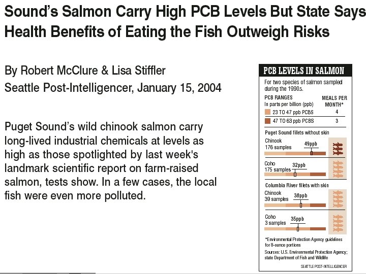 July 2003 • • Environmental Working Group PCB = 27 ppb 10 fish/questionable science Heavy PR (5 X wild, 40 x beef, etc)