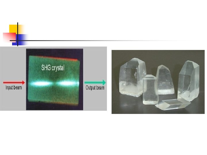 3. 3 Phát sóng hài bậc hai - SHG (Second harmonic gernegation ) n Thực nghiệm SHG được Franken và cộng sự công bố lần đầu tiên vào năm 1961: dùng bức xạ laser Ruby ( = 6943 Ao) chiếu vào tinh thể quartz, chùm tia ra có bức xạ = 3471 Ao