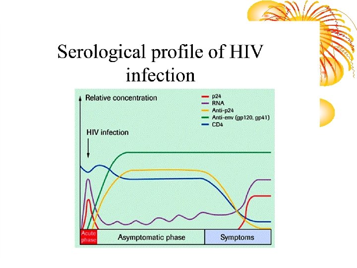 Serological profile of HIVinfection • HIV-RNA is the first marker that appears in circulation. • It appears as early as five days after infection. It peaks in the acute phase, drops down to low level in the chronic phase then starts to rise in the late stage of the infection. • HIV-Ag is the second marker that appear in circulation. • It appears as early as 7 - days after infection and disappears after 12 -weeks.