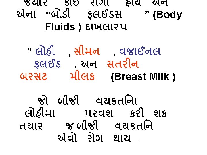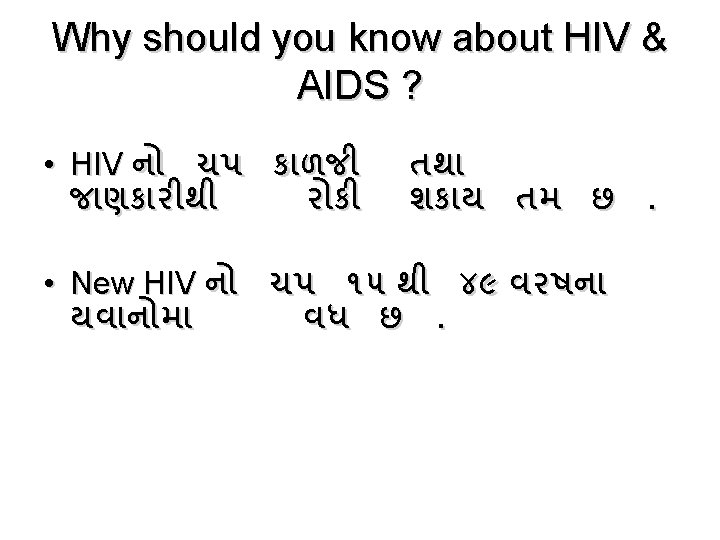 સ ર શ AIDS એ જ ત – ધરમ – ભ ષ શ કષ ત ક – અશ કષ ત ન ભદભ વથ ફલ ત નથ . . Prevention of AIDS is our joint responsibility. શ કષણ અન જ ગત is the only weapon in our hand. Let us accept the challenge to fight against AIDS.