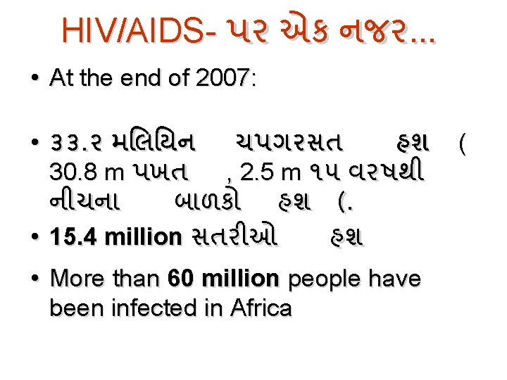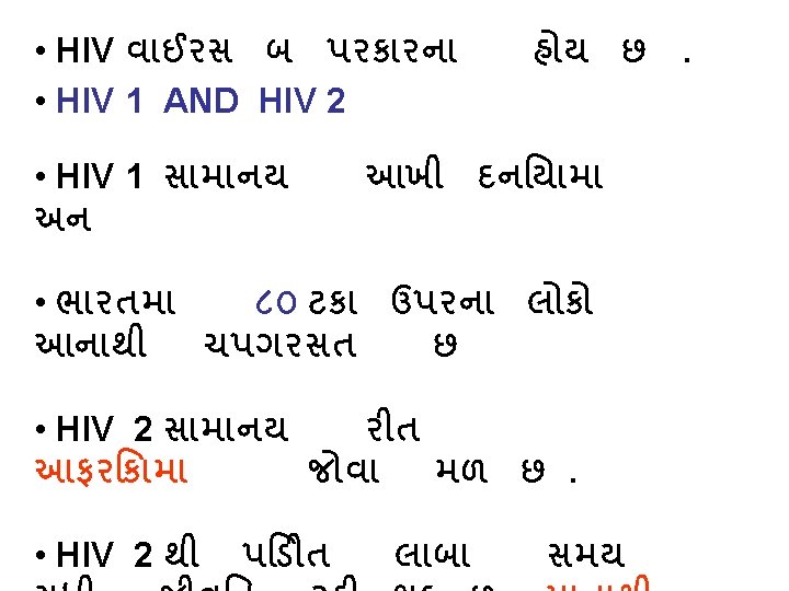 What is HIV/AIDS? • HIV : Human Immuno-deficiency Virus • (Gradually affects our immune system, i. e. the ability • to fight infections/diseases) • AIDS • A - Acquired )મળવલ ( • I - Immune ) ર ગ પરત ક ર શકત • D - Deficiency ) ઉણપ( • S - Syndrome ) લકષણ ( ( – A condition caused by deficiency in body’s immune system due to HIV. – It is a syndrome: a group of symptoms of various illnesses.