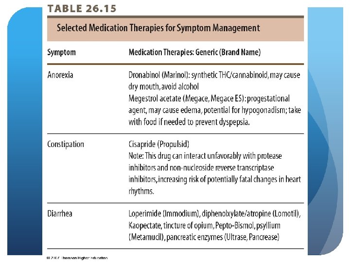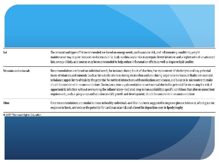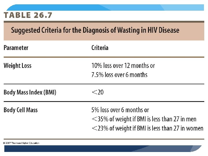 Nutrition Therapy Nutritional Implications AIDS-related wasting syndrome (AWS) Changes in body composition during weight loss like starvation or marasmus Weight loss or wasting even with adequate or increased kcal intake, may be immune mediated Decrease in LBM even without weight loss