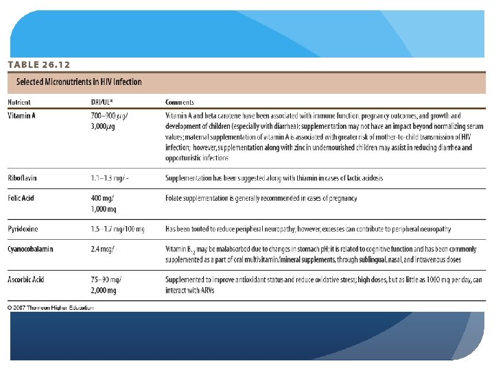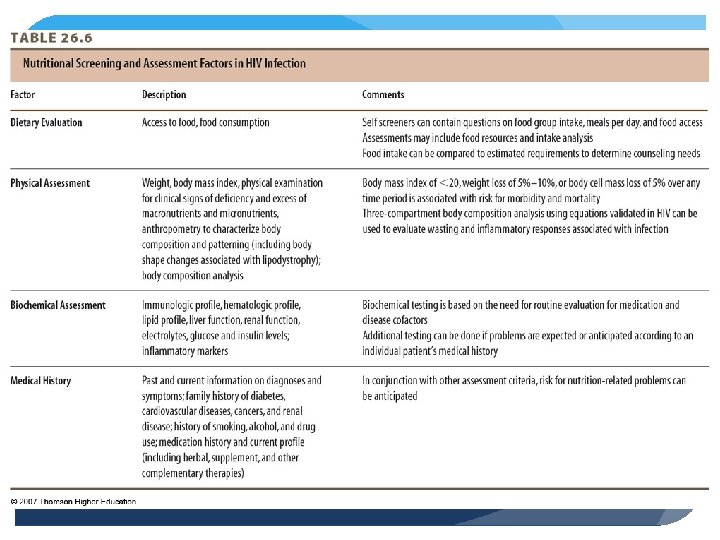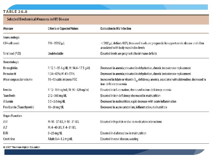 Nutrition Therapy Biochemical Assessment Viral load CD 4 count CRP Albumin Concerned about protein Liver function tests Medications effect their liver Look at stage they’re in Renal function tests Insulin, blood sugar Hormone levels