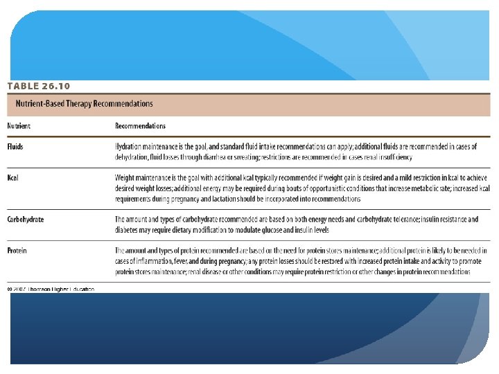 Nutrition Therapy Nutrition Interventions Macronutrient Therapy Fluid based on hydration maintenance Kcal based on balance for healthy weight Protein recommendations usually higher