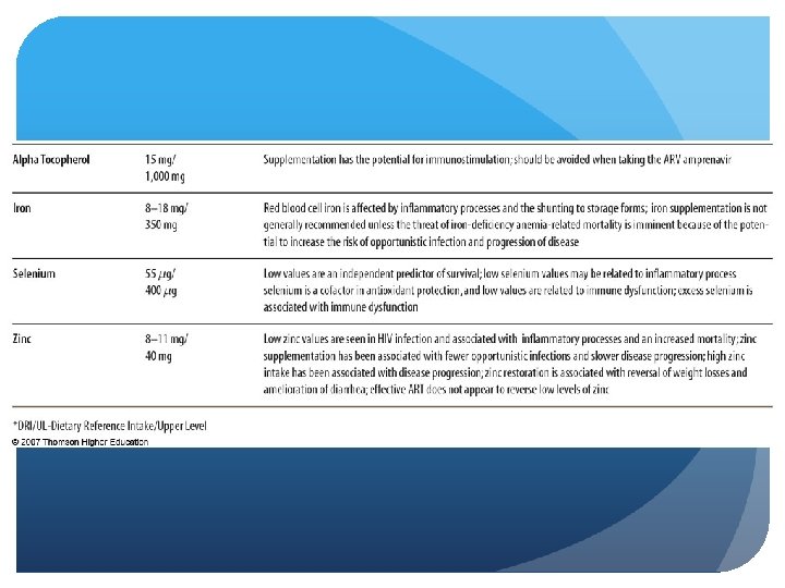 Nutrition Therapy Nutritional Implications Reduction in muscular protein influenced by medications Calories, protein Changes in macro- and micronutrient status Lower serum selenium, zinc, magnesium, calcium, iron, manganese, copper, carotene, choline, glutathione, vitamins A, B 6, B 12, E Carnotene: helps process fats/lipids