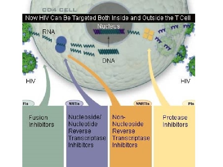Treatment of HIV • Current classes of antiretroviral drugs include: – Nucleoside/Nucleotide Reverse Transcriptase Inhibitors – Non-Nucleoside Reverse Transcriptase Inhibitors – Protease Inhibitors – Fusion or Entry Inhibitors – Integrase Inhibitors