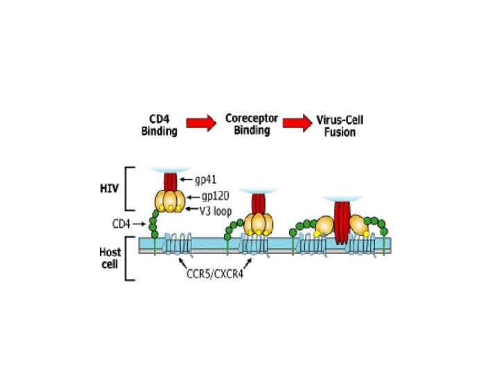 Fusion or Entry Inhibitors • Entry inhibitors prevent HIV from entering human immune cells. • There are several key proteins involved in the HIV entry process: – CD 4, a protein receptor found on the surface of Helper T cells in the human immune system, also called CD 4+ T cells – gp 120, a protein on HIV surface that binds to the CD 4 receptor – CCR 5, a second receptor found on the surface of CD 4+ cells, called a chemokine coreceptor – CXCR 4, another chemokine coreceptor found on CD 4+ cells – gp 41, a HIV protein, closely associated with gp 120, that penetrates the cell membrane