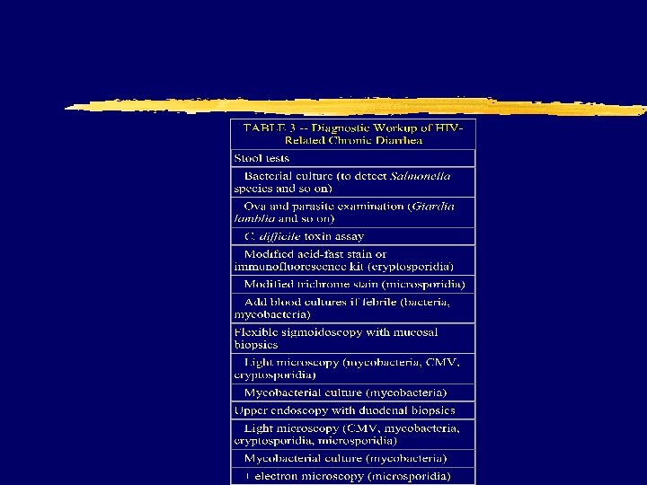 HIV and diarrhea z Stool studies y O&P y Trichrome y AFB y Immunohisto y Cdiff z Thorough history z Medication review z Low threshold for flex sig z Given the availability of effective treatment; more aggressive evaluation that often includes endoscopy has replaced the less invasive approach. z Treatment y Antimotility agents x. Imodium, Lomotil x. Opium y Calcium y octreotide