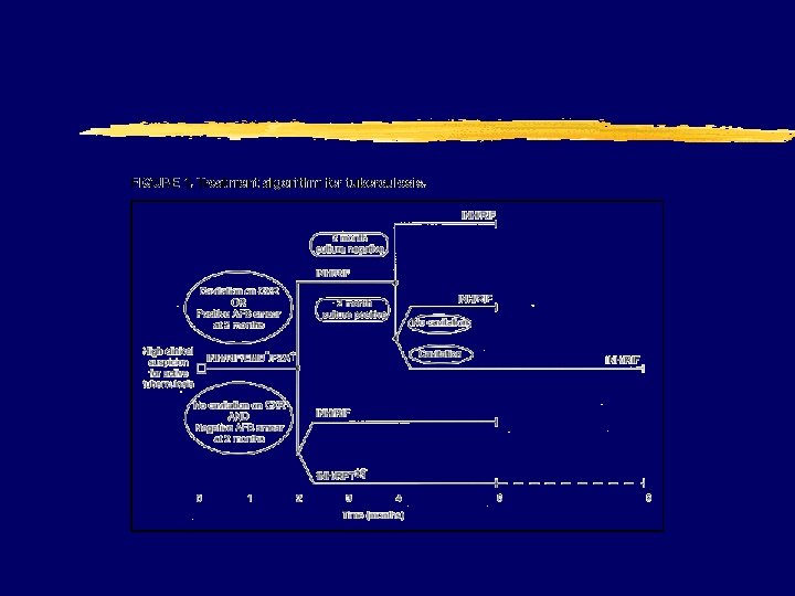 Tuberculosis z New guidelines y. Emphasize DOT and provider responsibility x. Louis Pasteur once said, "The microbe is nothing. . . the terrain everything" y. Reculture at 2 mo of trx x. Extend if still + and cavitary disease z INH--rifapentine once weekly continuation phase (Regimens 1 c and 2 b) is contraindicated z CD 4+ cell counts <100/µl should receive daily or three times weekly treatment z “paradoxical” flares occur y Associated w/HAART y Effusions, infiltrates, enlargement of CNS lesions, nodes, fever y Steroids used
