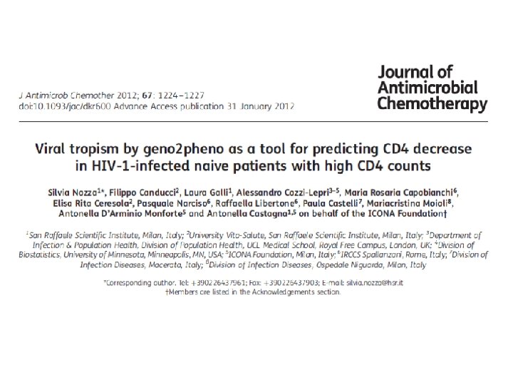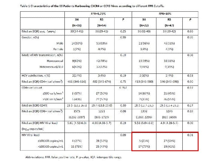 Baseline characteristics Characteristics OVERALL (N=223) R 5 (FPR>10%) (N=192) Non-R 5 (FPR≤ 10%) (N=31) (R 5 vs non-R 5) Age at sample collection (years) 35 (31 -40) 35 (31 -41) 33 (30 -37) 0. 183 Nationality Italian Other 211 (95%) 12 (5%) 181 (94%) 11 (6%) 30 (97%) 1 (3%) 0. 998 Gender Female Male 86 (39%) 137 (61%) 75 (39%) 117 (61%) 11 (35%) 20 (65%) 0. 843 Risk factor for HIV IVDU Heterosex 99 (44%) 124 (56%) 81 (82%) 111 (90%) 18 (18%) 13 (11%) 0. 120 1997 (1992 -2002) 1997 (1993 -2002) 1996 (1989 -1999) 0. 139 Nadir CD 4+ (cells/µL) 567 (453 -739) 575 (453 -739) 544 (461 -730) 0. 893 Months since HIV infection to sample collection 22. 0 (3. 5 -72. 7) 20. 2 (3. 0 -66. 2) 36. 9 (6. 5 -107. 1) 0. 178 Months since sample collection to the start of c. ART 16. 4 (3. 2 -37. 2) 13. 9 (3. 2 -38. 0) 18. 4 (4. 6 -34. 5) 0. 777 52 (23%) 51 (23%) 120 (54%) 48 (92%) 43 (84%) 101 (84%) 4 (8%) 8 (16%) 19 (16%) 0. 335 571 (458 -729) 581 (453 -731) 540 (468 -646) 0. 584 4. 1 (3. 6 -4. 6) 4. 0 (3. 5 -4. 3) 0. 343 Calendar year of HIV infection HCVab Negative Positive Unknown CD 4+ at sample collection (cells/µL) HIV-RNA at sample collection (log 10 copies/m. L) Median values (IQR) or n (%) P value