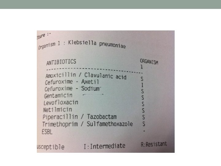 Day 2 • CT abdomen+ pelvis with contrast: • Left pyelonephritis or infarted kidney with left renal vein thrombosis • Blood culture: GNB • Anal abscess culture from private hospital: Klebsiella pnuemoniae, S strain