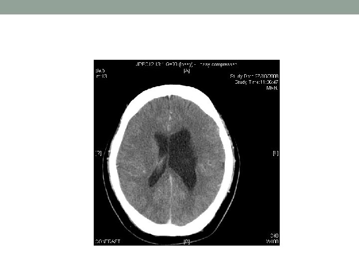 Day 2 • Review: • Neck soft • Plantar equivocal • Echo: • No effusion, LVEF OK, no obvious vegetation • CT brain: • no ICH • Focal dilatation of left lateral ventricle, ? porencephalic cyst due to previous insult in early infancy • LP: unremarkable