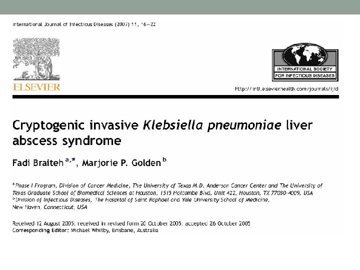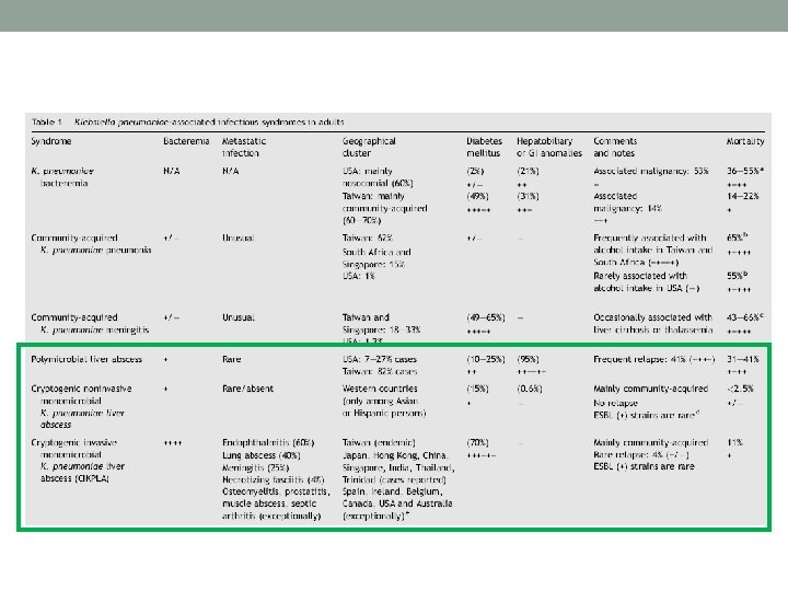 Cryptogenic invasive K. pneumoniae-associated liver abscess (CIKPLA) syndrome • Typically community-acquired • Unrelated to gastrointestinal or hepatobiliary anomalies • Highly associated with distant septic seeding • Distinguished by its geographical distribution • Exclusive to Taiwan (endemic) • A few cases have also been described in China, Korea, Singapore, Japan, India, Thailand, Trinidad, and Jamaica