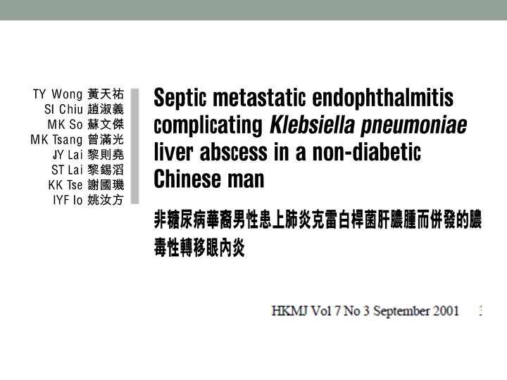 Case 1(continued) • Recent anal abscess Dx in private • Newly diagnosed DM • Presented with DKA complicated with ACS/ AKI/ septic shock • S strain Klebsiella pneumoniae bacteraemia • Found infected and infarted L kidney with nephrectomy done • Residual retroperitoneal collection also drained • Found blindness on day 20