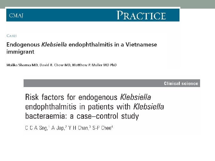 CIKPLA syndrome • 20 -fold increased association with diabetes mellitus • Frequently complicated by metastatic infections • Endophthalmitis is the most common (as many as 60% of cases) • Lung abscesses (40%), meningitis (25%), and necrotizing fasciitis (4%) • Prostatitis, osteomyelitis, septic arthritis, septic epidural abscesses, and muscle abscesses have occasionally been reported
