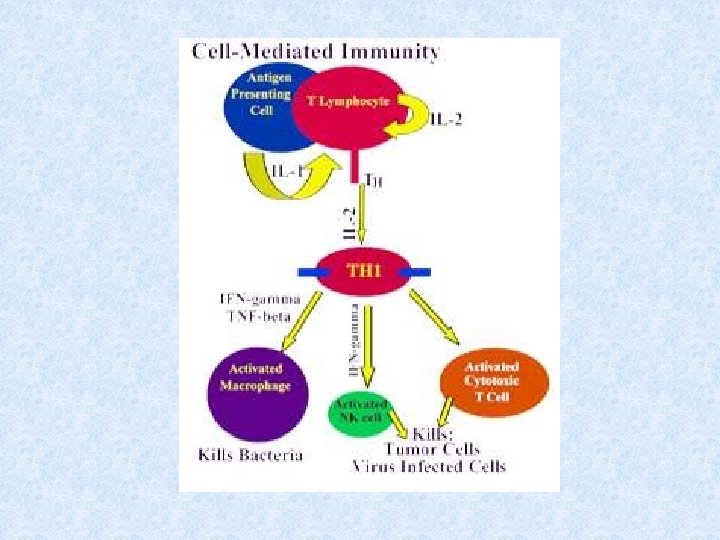 TH 1 based immune response § The infected macrophage produces protein fragments derived from intracellular parasites, some of which are presented on the surface in the complex with MHC gp class II § Macrophages and dendritic cells stimulated by certain microorganisms produce IL-12 § TH precursor, which detects the infected macrophage and receives signals via the TCR, CD 28 and receptor for IL-12 proliferates and differentiates into effector TH 1 cells that produce IFNg and IL-2. § IFNg activates macrophage NO synthase IL-2 is growth factor for T cells
