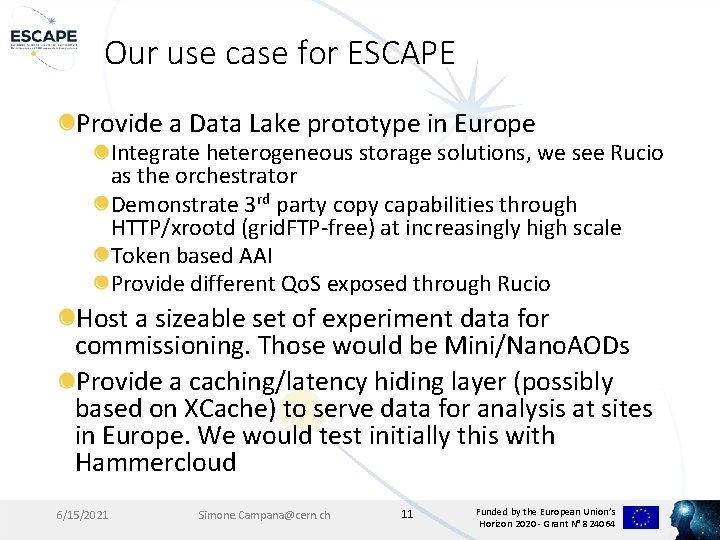 Our use case for ESCAPE Provide a Data Lake prototype in Europe Integrate heterogeneous storage solutions, we see Rucio as the orchestrator Demonstrate 3 rd party copy capabilities through HTTP/xrootd (grid. FTP-free) at increasingly high scale Token based AAI Provide different Qo. S exposed through Rucio Host a sizeable set of experiment data for commissioning. Those would be Mini/Nano. AODs Provide a caching/latency hiding layer (possibly based on XCache) to serve data for analysis at sites in Europe. We would test initially this with Hammercloud 6/15/2021 Simone. Campana@cern. ch 11 Funded by the European Union’s Horizon 2020 - Grant N° 824064