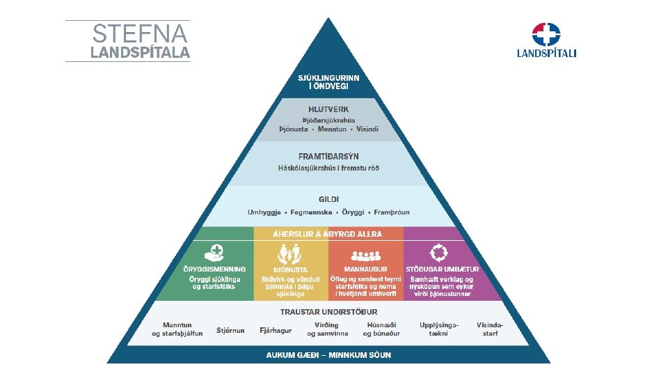 FRAMTÍÐARSÝN Markmið Landspítala er að vera háskólasjúkrahús í fremstu röð þar sem sjúklingurinn og öryggi hans og gæði þjónustu eru ávallt í öndvegi. Landspítali nýtir gagnreynda þekkingu á þjónustu, stjórnun og menntun. Þar er markvisst unnið að nýsköpun og þróun nýrrar þekkingar til að auka virði þjónustunnar. Landspítali er öflugur bakhjarl heilbrigðisþjónustu um allt land.
