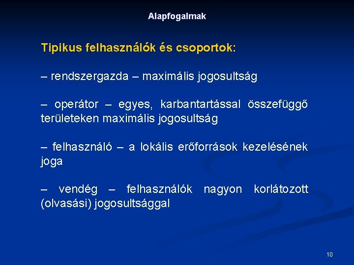 Alapfogalmak Tipikus felhasználók és csoportok: – rendszergazda – maximális jogosultság – operátor – egyes, karbantartással összefüggő területeken maximális jogosultság – felhasználó – a lokális erőforrások kezelésének joga – vendég – felhasználók nagyon korlátozott (olvasási) jogosultsággal 10