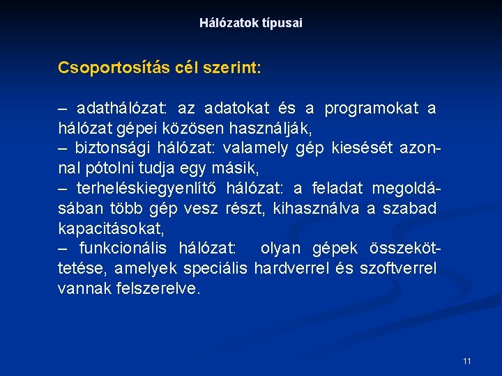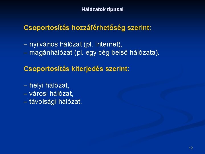 Hálózatok típusai Csoportosítás cél szerint: – adathálózat: az adatokat és a programokat a hálózat gépei közösen használják, – biztonsági hálózat: valamely gép kiesését azonnal pótolni tudja egy másik, – terheléskiegyenlítő hálózat: a feladat megoldásában több gép vesz részt, kihasználva a szabad kapacitásokat, – funkcionális hálózat: olyan gépek összeköttetése, amelyek speciális hardverrel és szoftverrel vannak felszerelve. 11