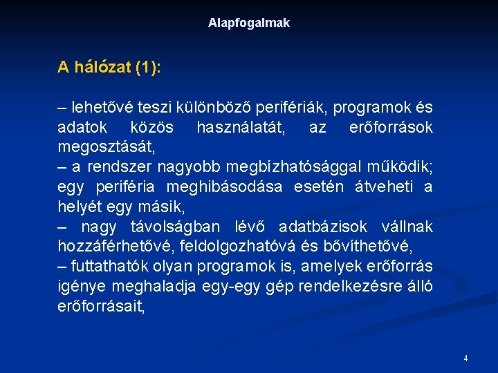 Alapfogalmak „Számítógép-hálózat alatt kapcsolatban önálló lévő az egymással számítógépek rendszerét értjük”. (Kónya, 2001. ) 3