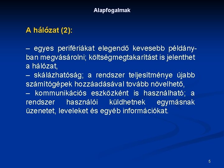 Alapfogalmak A hálózat (1): – lehetővé teszi különböző perifériák, programok és adatok közös használatát, az erőforrások megosztását, – a rendszer nagyobb megbízhatósággal működik; egy periféria meghibásodása esetén átveheti a helyét egy másik, – nagy távolságban lévő adatbázisok vállnak hozzáférhetővé, feldolgozhatóvá és bővíthetővé, – futtathatók olyan programok is, amelyek erőforrás igénye meghaladja egy-egy gép rendelkezésre álló erőforrásait, 4