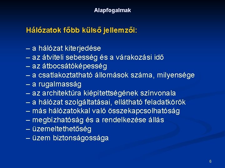 Alapfogalmak A hálózat (2): – egyes perifériákat elegendő kevesebb példányban megvásárolni; költségmegtakarítást is jelenthet a hálózat, – skálázhatóság; a rendszer teljesítménye újabb számítógépek hozzáadásával tovább növelhető, – kommunikációs eszközként is használható; a rendszer használói küldhetnek egymásnak üzenetet, leveleket és egyéb információkat. 5