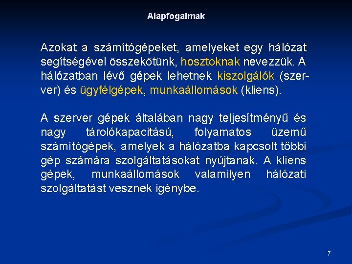 Alapfogalmak Hálózatok főbb külső jellemzői: – a hálózat kiterjedése – az átviteli sebesség és a várakozási idő – az átbocsátóképesség – a csatlakoztatható állomások száma, milyensége – a rugalmasság – az architektúra kiépítettségének színvonala – a hálózat szolgáltatásai, ellátható feladatkörök – más hálózatokkal való összekapcsolhatóság – megbízhatóság és a rendelkezése állás – üzemeltethetőség – üzem biztonságossága 6