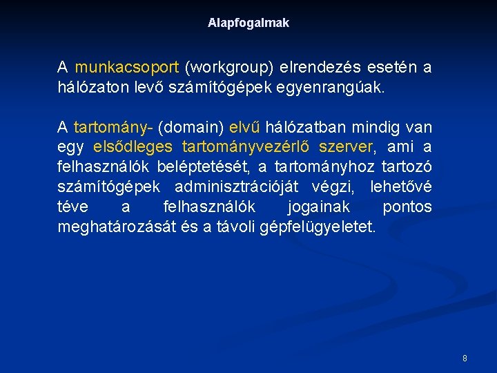 Alapfogalmak A munkacsoport (workgroup) elrendezés esetén a hálózaton levő számítógépek egyenrangúak. A tartomány- (domain) elvű hálózatban mindig van egy elsődleges tartományvezérlő szerver, ami a felhasználók beléptetését, a tartományhoz tartozó számítógépek adminisztrációját végzi, lehetővé téve a felhasználók jogainak pontos meghatározását és a távoli gépfelügyeletet. 8