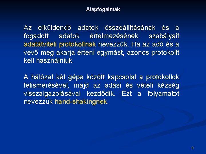 Alapfogalmak Az elküldendő adatok összeállításának és a fogadott adatok értelmezésének szabályait adatátviteli protokollnak nevezzük. Ha az adó és a vevő meg akarja érteni egymást, azonos protokollt kell használniuk. A hálózat két gépe között kapcsolat a protokollok felismerésével, majd az adási és vételi kézség visszaigazolásával kezdődik. Ezt a folyamatot nevezzük hand-shakingnek. 9