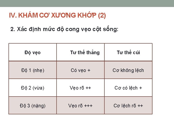 IV. KHÁM CƠ XƯƠNG KHỚP (1) - Mục đích: Khám đánh giá tình trạng cong vẹo cột sống và một số dị tật bẩm sinh (dính ngón, thừa ngón…), dị dạng tay chân (chân vẹo, cong…) - Nhân sự: bác sĩ chuyên khoa nội hoặc ngoại tổng quát. - Yêu cầu: có phòng riêng hoặc góc khám kín đáo. 1. Phân loại kết quả: - Xác định hình thể cong, vẹo cột sống - Tư thế nghiêng: gù, còng, ưỡn, bẹt - Tư thế thẳng: • Vẹo hình chữ C thuận (Ct) • Vẹo hình chữ C ngược (Cn) • Vẹo hình chữ S thuận (St) • Vẹo hình chữ S ngược (Sn)
