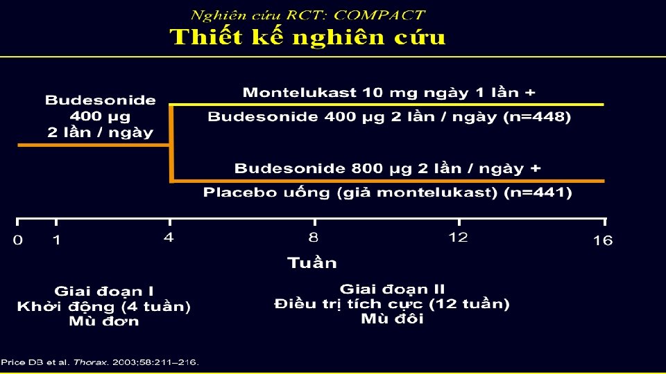 HIỆU QUẢ KIỂM SOÁT HEN: MONTELUKAST & BECLOMETHASONE Montelukast 10 mg mỗi ngày (n=339) N = 728 Beclomethasone 200 μg 2 lần mỗi ngày (n =332 ) Dùng giả dược 0 • 6 W Nghiên cứu ngẫu nhiên, đa trung tâm, mù đôi, 2 nhóm bệnh nhân hen có FEV 1 dự đoán trong khoảng 50% - 85% đang sử dụng trung bình hơn 2 nhát SABA hàng tuần. J Elliot Israel, MD, Paul S. Chervinsky, MD, ALLERGY CLIN IMMUNOL VOLUME 110, NUMBER 6