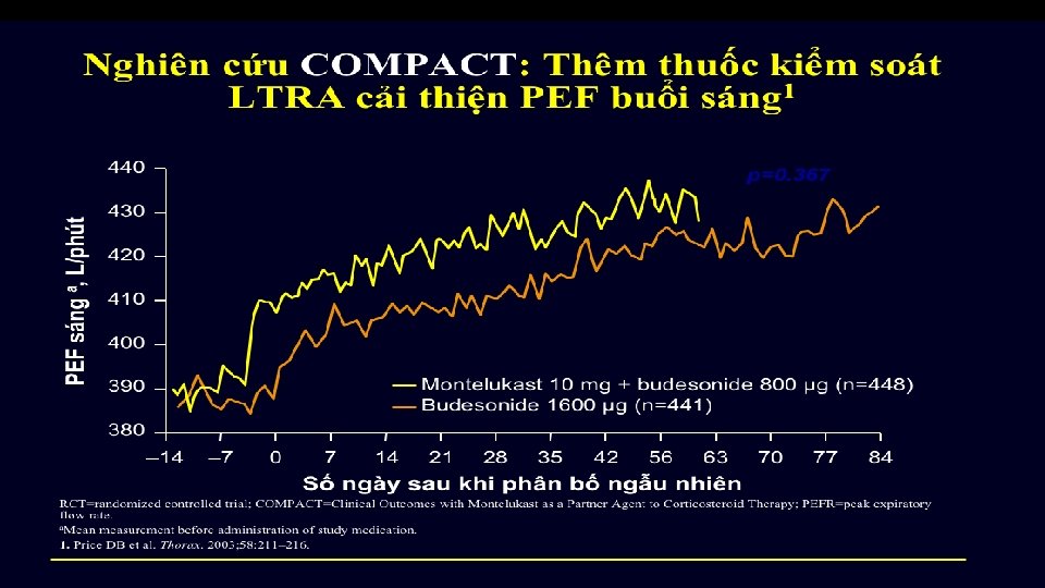 Điều trị VMDU giúp kiểm soát hen? NC COMPACT: phân tích dưới nhóm ở bệnh nhân hen kèm VMDU điều trị budesonide + montelukast, có sự cải thiện có ý nghĩa PEF buổi sáng so với nhóm đơn trị budesonide gấp đôi liều. Sự khác biệt này không thấy ở nhóm BN không kèm VMDU Ø Montelukast điều trị VMDU cải thiện chức năng phổi. Price DB et al. Allergy. 2006; 61: 737– 42.