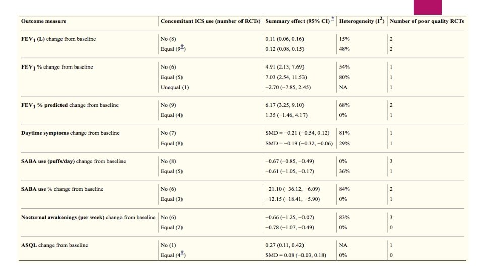 LTRA : giảm nguy cơ đợt cấp/Hen nhẹ Miligkos M et al. Leukotriene-receptor antagonists versus placebo in the treatment of asthma in adults and adolescents: a systematic review and meta-analysis. Ann Intern Med 2015; 163: 756.