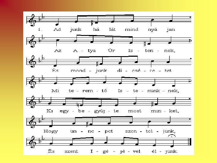 Záróének: 2. Hála, hogy ébren szentegyházad: Nappalokon és éjeken Szüntelen áldhat és imádhat, Nem hallgat el egy percre sem. 3. Mert int a hajnal könnyű szárnya, Nem pihen, partról partra kel, Zeng új dicséret és új hála, Néped imája nem hal el. 4. Már a nap távol testvért ébreszt, Még alig hamvad fénye itt, Friss ajak dicsér egyre téged, És magasztalja tetteid. 5. Így legyen! Mert tiéd az ország, A hatalom és dicsőség. Jő a nap, melyen majd együtt áld És együtt dicsér minden nép.