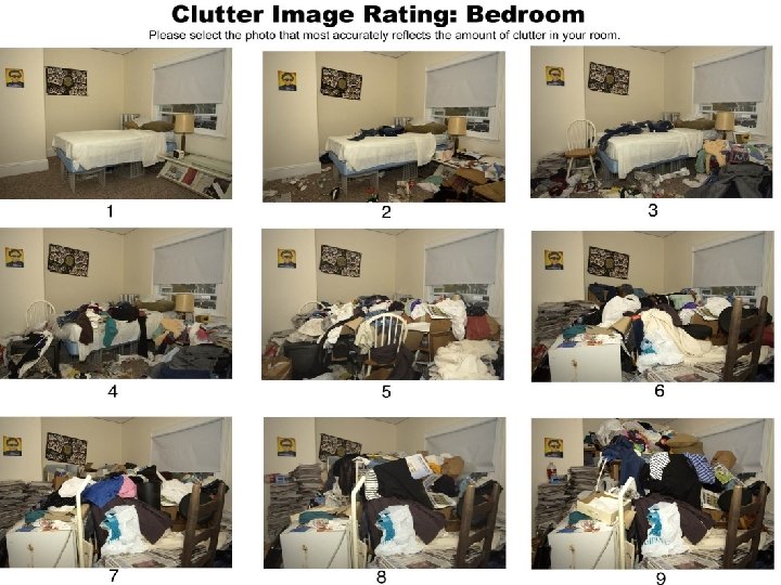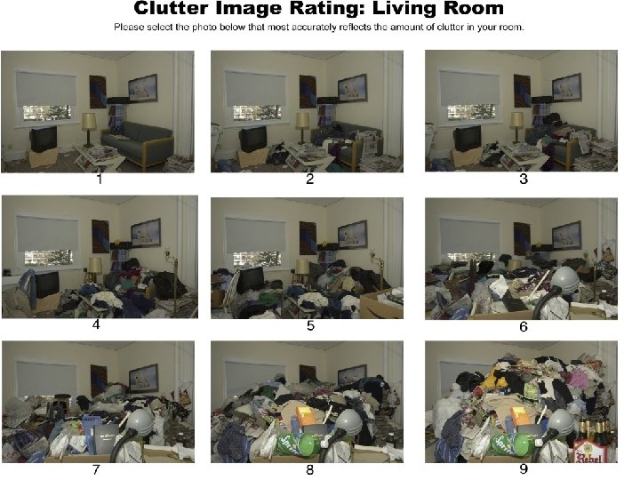 What We Encountered in the Veteran’s Apartment • Clutter rating of 5 -6, based on presentation images • Stacks of unopened boxes from regular Amazon Prime and QVC purchases, sometimes in duplicate, of household appliances, exercise equipment, diet supplements, etc • A 2 -3 foot high barricade of food wrappers and containers, surrounding the reclining chair where she sits most of day • Piles of garbage next to bags of garbage and overflowing bin • Overflowing cat litterbox, urine soaked carpet, a dead decomposing mouse in the hall • Roach, fly and mouse infestations • A waist-height wall of belongings, boxes, papers, etc. , around the perimeter of the apartment • A stagnant oppressive odor – “feels like you’ve stepped into a tropical climate”
