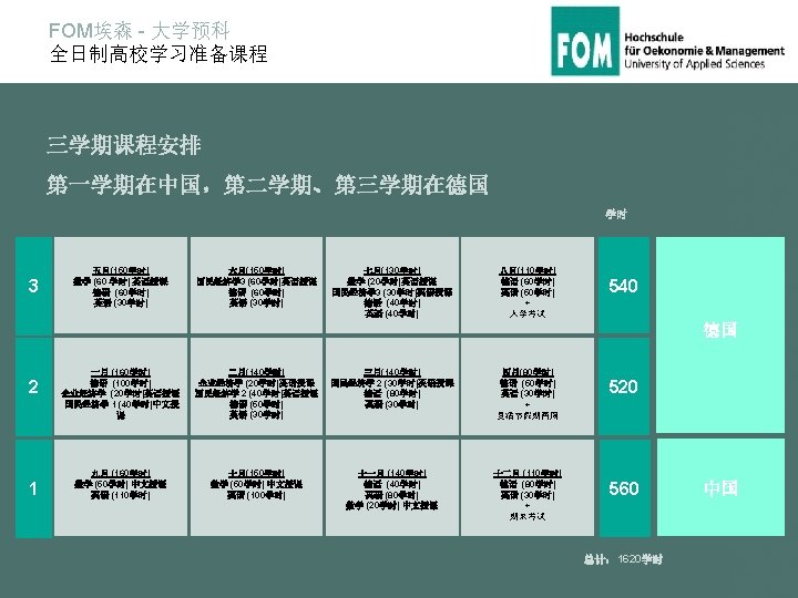 FOM埃森 - 大学预科 全日制高校学习准备课程 Trimester-Aufbau 三学期课程安排 Stunden 3 Mai (150 UE) Mathematik (60 UE) engl. Deutsch (60 UE) Englisch (30 UE) Juni (150 UE) VWL 3 (60 UE) engl. Deutsch (60 UE) Englisch (30 UE) Juli (130 UE) Mathematik (20 UE) engl. VWL 3 (30 UE) engl. Deutsch (40 UE) Englisch (40 UE) August (110 UE) Deutsch (60 UE) Englisch (50 UE) + Feststellungsprüfung 540 Deutschland 2 Januar (160 UE) Deutsch 2 (100 UE) BWL (20 UE) engl. VWL 1 (40 UE) chin. Februar (140 UE) BWL (20 UE) engl. VWL 2 (40 UE) engl. Deutsch (50 UE) Englisch (30 UE) März (140 UE) VWL 2 (30 UE) engl. Deutsch (80 UE) Englisch (30 UE) April (80 UE) Deutsch (50 UE) Englisch (30 UE) + 2 Wochen Osterferien 1 September (160 UE) Mathematik (50 UE) chin. Englisch (110 UE) Oktober (150 UE) Mathematik (50 UE) chin. Englisch (100 UE) November (140 UE) Deutsch 1 (40 UE) Englisch (80 UE) Mathematik (20 UE) chin. Dezember (110 UE) Deutsch 1 (80 UE) Englisch (30 UE) + Zwischenprüfung 520 560 Gesamt: 1620 Stunden China