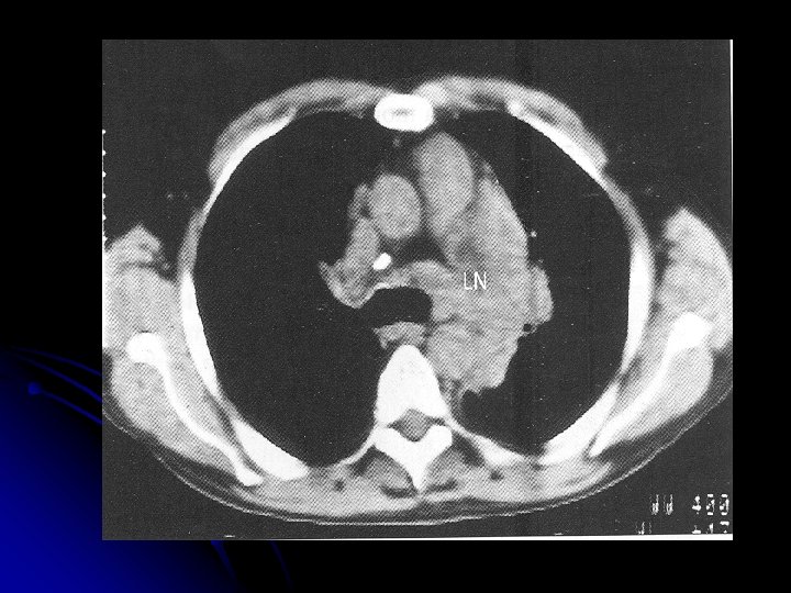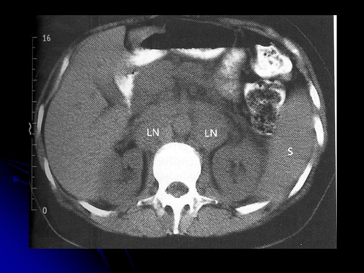 Investigations l l l l l CBP : Anemia ( normochromic / normocytic), eosinophilia, neutrophilia, lymphopenia ESR -raised LFT- (liver infil / obs at porta hepatis) RFT- prior to treatment Urate , Ca, LDH - adverse prognosis CXR- mediastinal mass CT thorax / abdomen / pelvis-for staging Other: Gallium scan, PET, Lymphangiography , Laporotomy