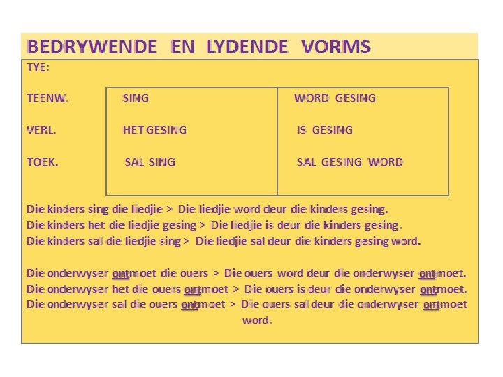BEDRYWENDE EN LYDENDE VORMS TYE: TEENW. SING WORD GESING VERL. HET GESING IS GESING TOEK. SAL SING SAL GESING WORD Die kinders sing die liedjie ˃ Die liedjie word deur die kinders gesing. Die kinders het die liedjie gesing ˃ Die liedjie is deur die kinders gesing. Die kinders sal die liedjie sing ˃ Die liedjie sal deur die kinders gesing word. Die onderwyser ontmoet die ouers ˃ Die ouers word deur die onderwyser ontmoet. ont Die onderwyser het die ouers ontmoet ˃ Die ouers is deur die onderwyser ontmoet. ont Die onderwyser sal die ouers ontmoet ˃ Die ouers sal deur die onderwyser ontmoet ont word.