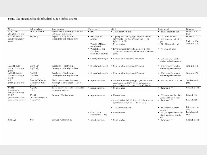 • Voorbeeld – samenvatting van literatuurstudie, als guideline te gebruiken Ref. Type studie Sample karakteristiek. Variabel en Hoe gemeten? Interventie/ experimenteel protocol Resultaten Epidem. (relaties) Gen. Epidem. (linkage/associatie) Experimenteel/interventie Dierexperim. In vitro Leeftijd (X-SD) Geslacht Type (fam. /sibs/twins ) Aantallen Strain FA (totaal/w erk/VT) Gen/ m. RNA/ eiwit Vragenlijst/ accelerom. RT-PCR, Chip-arrays Geen Duur/frequentie /belasting Correlaties Effecten (stijgen/dalen, sign, trend)