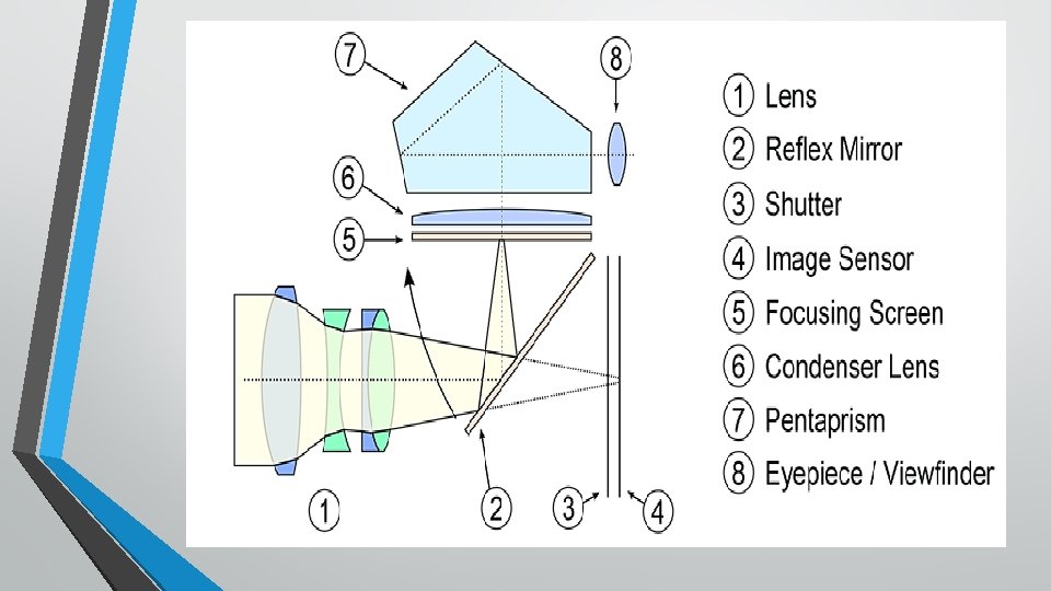 Hoe werkt een spiegelreflexcamera? (DSLR) Wanneer je door het scherm of de DSLR-zoeker / oculair op de achterkant van de camera kijkt, zie je wat de camera op dit moment kan vastleggen door de lens (1). Dit gebeurt met behulp van een reflexspiegel (2) die het zicht reflecteert op zowel het scherm als het punt waar je met je ogen doorheen kan kijken. Deze spiegel zit in een hoek van 45 graden in de camerakamer. Deze stuurt het licht vervolgens verticaal naar een optisch element dat een “pentaprisma” wordt genoemd (7). Het pentaprisma converteert vervolgens het verticale licht naar een horizontaal licht door het op twee afzonderlijke spiegels scheef van elkaar te richten. Hierna wordt het zichtbaar in de zoeker (8). Wanneer je een foto maakt op een spiegelreflexcamera, zwaait de reflectiespiegel (2) naar boven, blokkeert het verticale pad en laat het licht direct door. Vervolgens gaat de sluiter (3) open en bereikt het licht de beeldsensor (4). De sluiter (3) blijft zo lang open als nodig is voor de beeldsensor (4) om het beeld op te nemen. De sluiter (3) wordt gesloten en de reflectiespiegel (2) valt daarna terug naar de hoek van 45 graden.