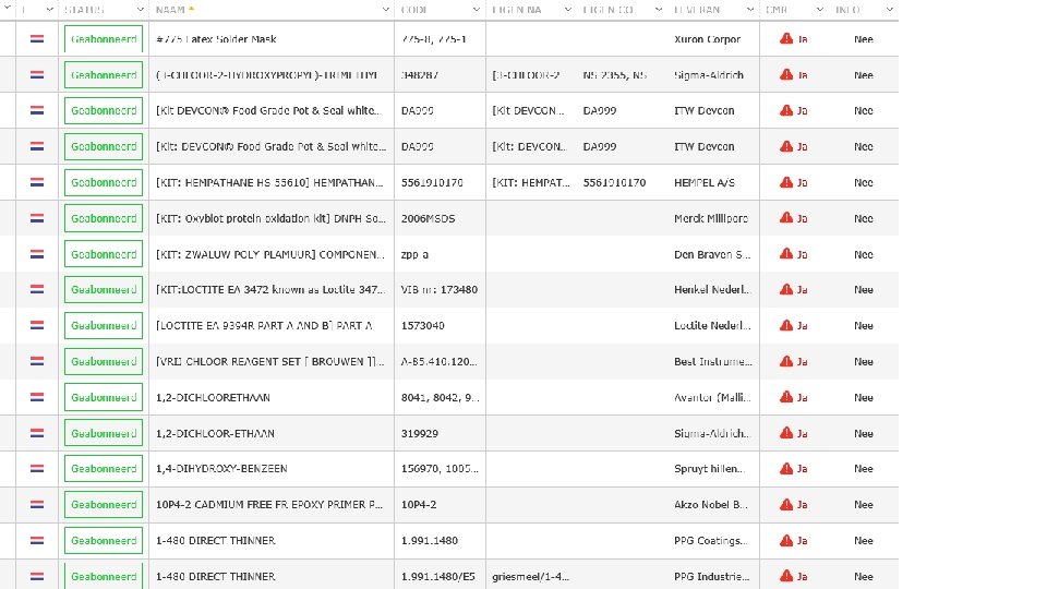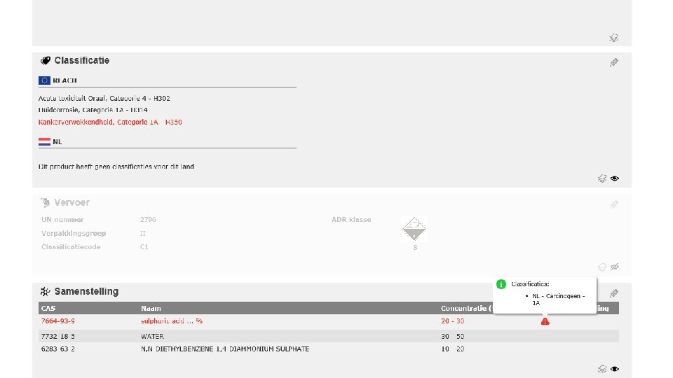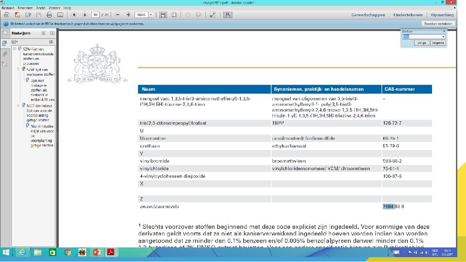 Dus Handmatig: 1. 2. 3. 4. 5. Actueel SDS (< 3 jaar) Check symbolen Check de componenten (CAS) via de Staatscourant Lijst (ieder ½ jaar) Check het percentage van dit component in de stof Deel in de stof in de klasse in en bepaal waar er mee wordt gewerkt. “Het beoordelen van een SDS op zicht is niet aan te raden, gebruik altijd de controle via de Staatcourantlijst en Tabel 3. 1 om er zeker van te zijn of een stof CMR is !” (T) (T)